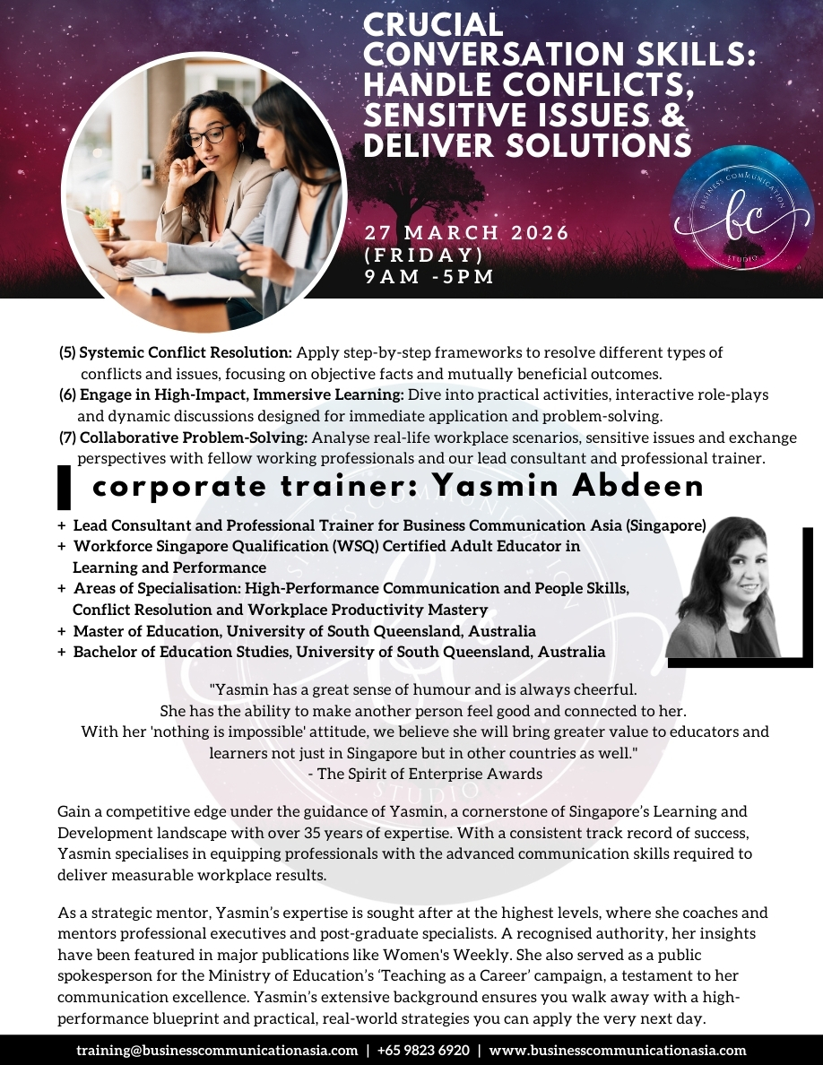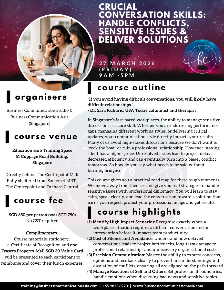 POs, if any, can be issued to ‘Business Communication Studio’.Class size is capped to maximise training effectiveness for every participant.